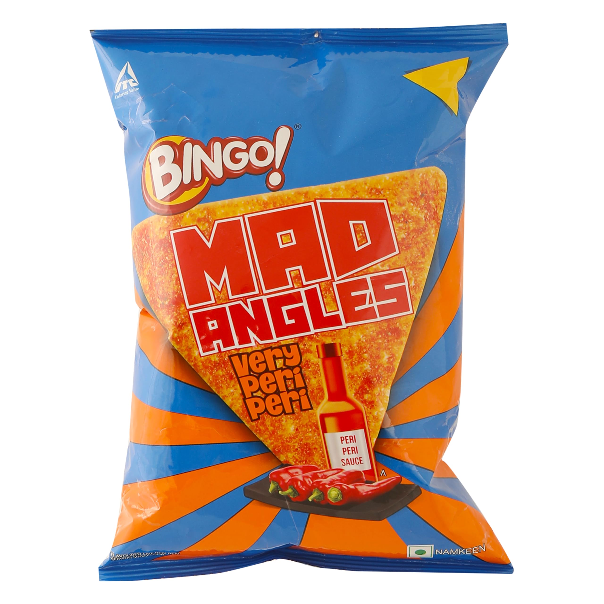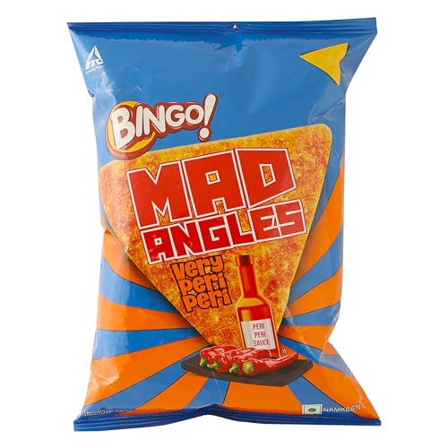 Spice up your day with the yummy and crunchy bingo! Mad angles very peri peri. Keep the tissue box handy and an excuse ready as the chips will make your mouth as well as your eyes water. Bingo! Mad angles brings together the best of both worlds a contemporary indian snack with an international taste that's loved by everyone. These spicy chips are crispy crunchy and perfectly triangular. Bingo! Mad angles chips are cooked with rice grits and flour. The fiery peri peri chillies are added to the chips which will set your senses on fire with every crunchy bite. Just open a pack whenever you are in the mood to spice things up. Whether you're listening to your professor drone on waiting for your phone to update or waiting for your local train. A bag of bingo! Mad angles very peri peri will always bring the spicy madness you crave.