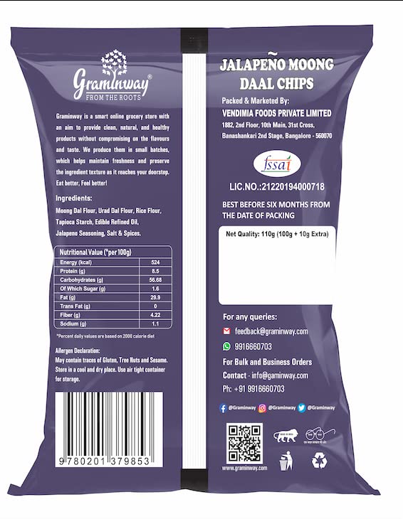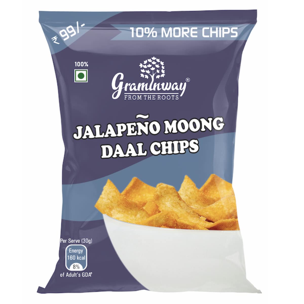One of the most widely used lentils in Indian cuisine yellow moong dal is used to make both sweet and spicy dishes. Moong dal is great for weight loss improving heart health lowers blood sugar and aiding digestion. Graminways Moong Daal Chips Jalapeno is a fusion of two cultures. The Indian dinner staple meets Mexican favourite jalapenos in a wonderful spicy tangy melange. Moong daal is cleaned finely ground and made into a soft dough. We throw in Indian seasoning and jalapeno peppers cut the dough into strips and bake them and irresistible healthy chips are ready. Now this is a snack you can reach out for guilt-free!