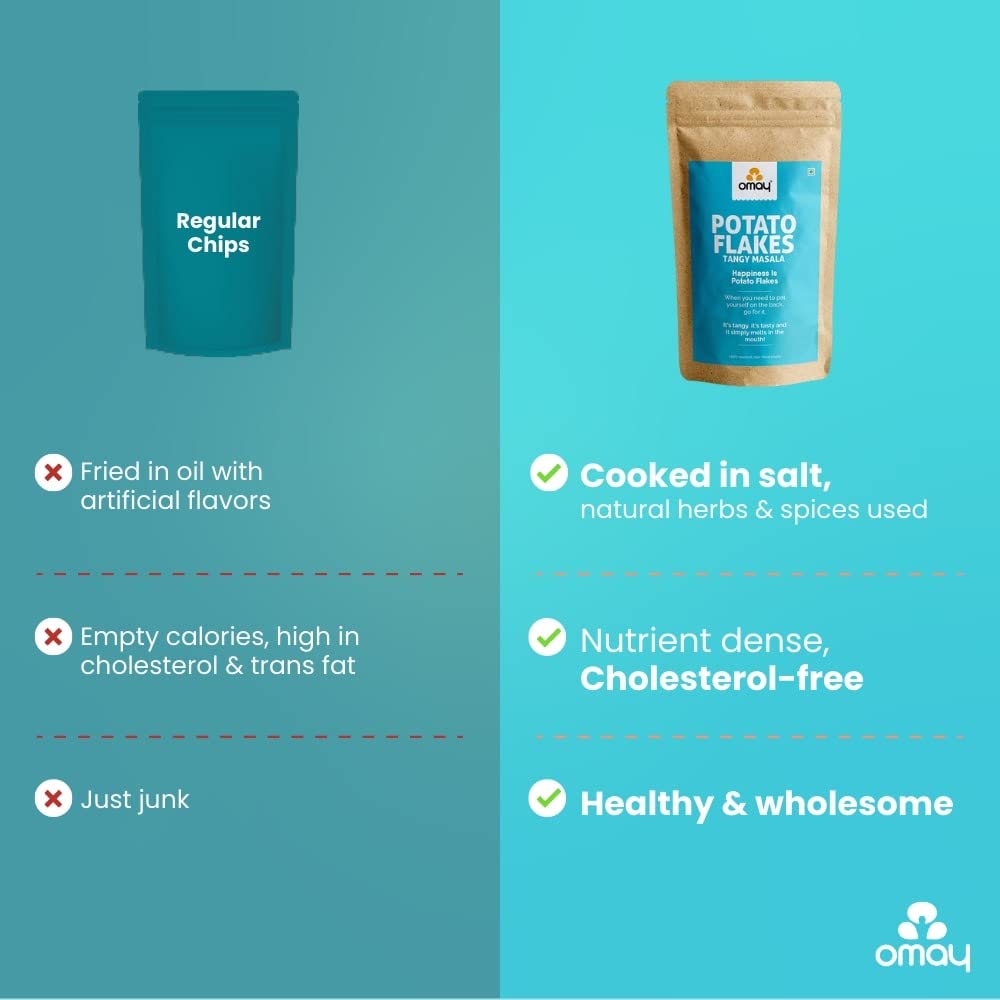 HomeGrocerySnacksChipsOmay Foods Roasted Potato Flakes (Aloo Laccha) 200g Pouch (Pack of 2) | Healthy Snacks | 100% Oil-Free | Roasted Namkeen snack I Sugar free snack I Travel Snack I Office time Snack I Evening Snack I Late Night Snack