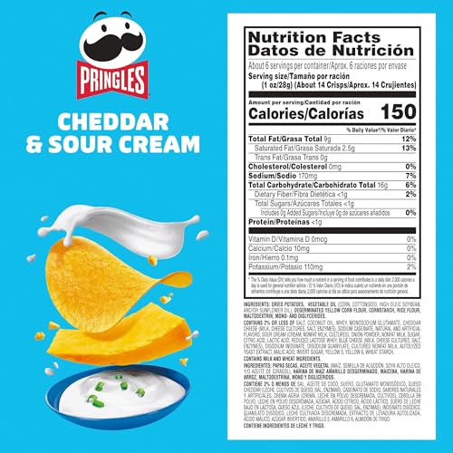 This Chips Prodcut is Pringles Cheddar & Sour Cream Naturally and Artificially Flavored Con Sabor Potato Crisps 158g