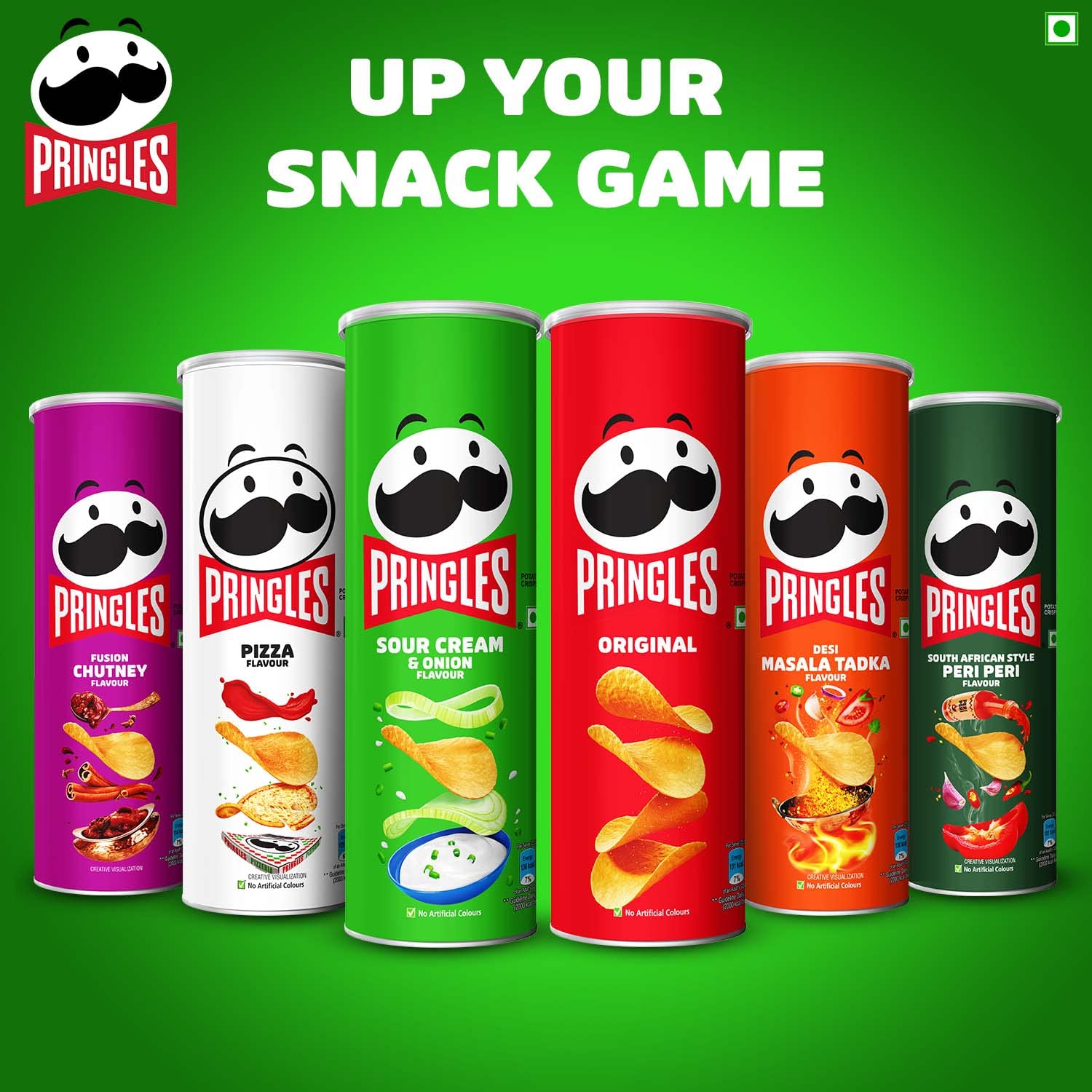 6 FLAVOURS - GRAB THEM All- Pringles Potato Chips come in 6 exciting flavors. Try the extensive range of Pringles Potato Chips as Sour Cream n Onion Original Desi Masala Peri Peri Fusion Chutney and Pizza. Pick your favorite or grab them all.
