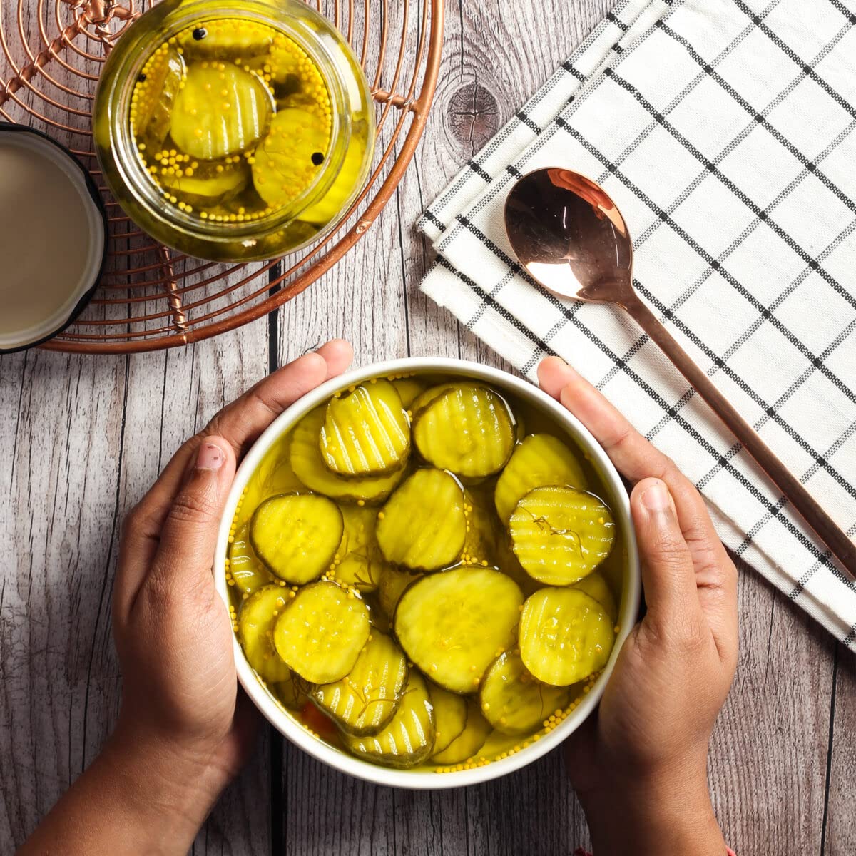 Gherkins (53%) Water Sugar Acetic Acid Citric Acid Salt Firming Agent (E509) Dill Weed Onion Red Capsicum Yellow Mustard Black Pepper Turmeric Oleoresin.