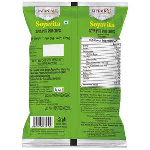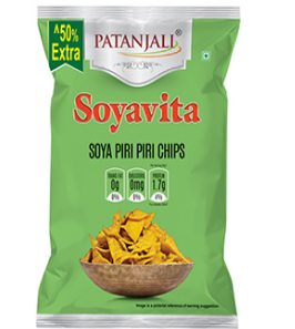 Patanjali Soyavita Soya Piri Piri Chips is a healthy and nutritious snack which is high in protein and made up of Soybean and has great Piri Piri flavour. Soya has various antioxidants and organic compounds which helps in boosting your health. It can be enjoyed anytime as it has zero percent trans fat and zero percent cholesterol.TastySpicyA healthy snack option.High in Protein0% transfat, Cholesterol and Sugar.Improves digestionCrunchyRice Flour StarchPalmolien OilDefatted Soya flourUrad dalSpices and Condiments(Chilli, pepper, Onion, Garlic, Tomato)Corn starchEdible common saltSugarHydrolysed Vegetable Protein(soya)Acidity regulatorAnti caking agent