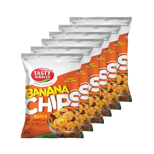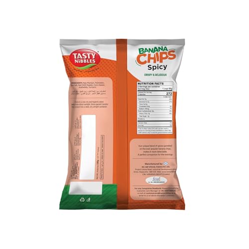 Tasty Nibbles Spicy Banana chips is a unique blend of spices sprinkled on the ever-popular banana chips makes it more delectable. A perfect companion for the evening tea/coffee. Ingredients: Raw Plantain Palmolein Sea salt Red chilli powder Curry leaves AsafoetidaTurmeric. Available qty : 600g.