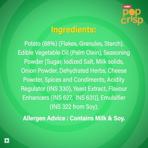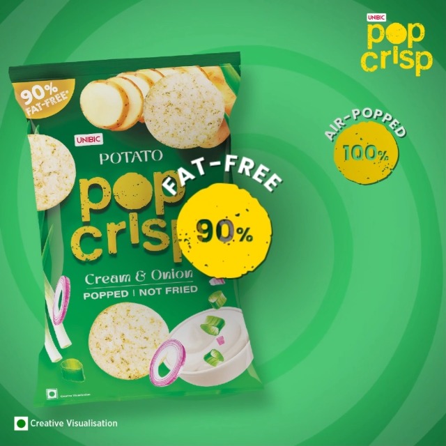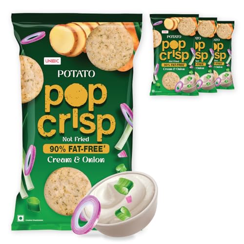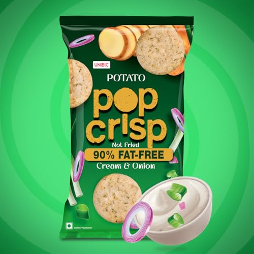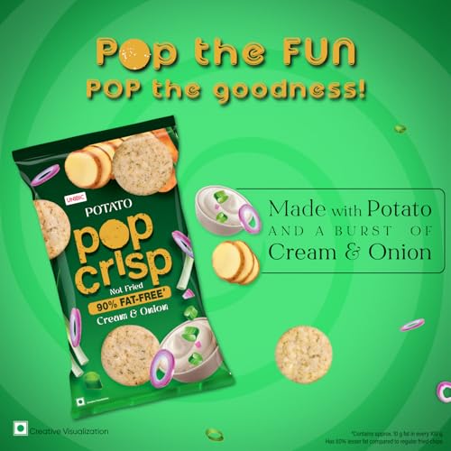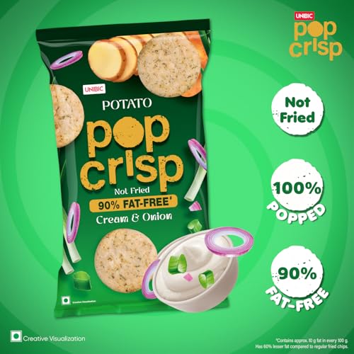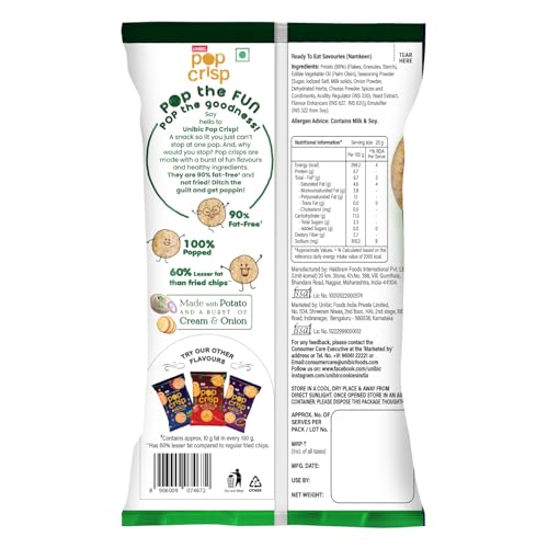 Unibic Pop Crisp â Let's Get Poppin'! These lip-smacking potato chips featuring innovative popping technology redefine your snacking experience. Indulge in the irresistible Potato with Cream & Onion flavor while bidding farewell to greasy high-fat snacks! With an impressive 90% less fat Pop Crisp lets you snack with satisfaction without compromising on health. Popped not fried these crisps offer a light and crispy texture ensuring guilt-free indulgence. Whether you're at work on the go or enjoying downtime at home Unibic Pop Crisp is your smart snacking choice for a healthier and tastier option. Elevate your snacking game with this flavorful and crunchy Cream & Onion delight â Pop it like a Boss!