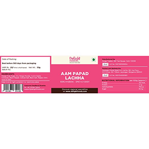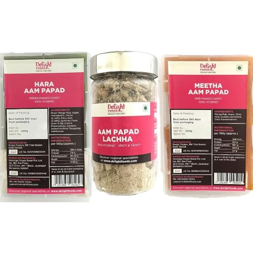 Aam papads one of the most popular delicacies prepared using mango the king of all the fruits. One of the most common dilemma is what flavour to try sweet tangy or the chatpata. Well worry not. Delight foods brings to you an amazing aam papad combo that include all the three flavours. Our aam papad are packed and processed in a very hygienic conditions. Only the finest mango pulp spices and other ingredients are used in the preparation of these aam papads. So this combo to enjoy the taste of meetha aam papad hara aam papad and aam papad lachha. Traditional flavours that will surely take you down the memory lane. Vegetarian before 365 days from date of packing keep in a cool & dry place.