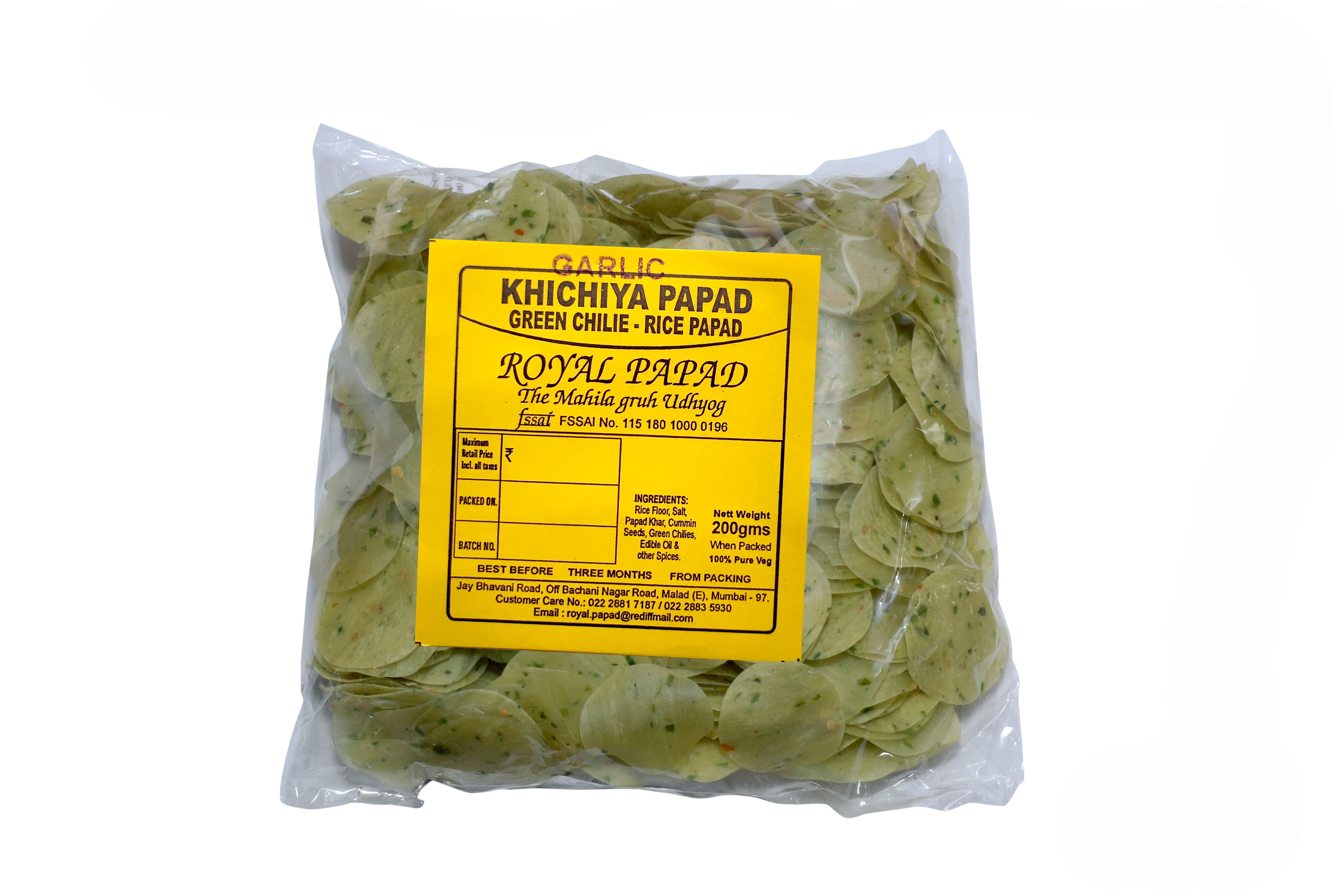 A RICE LIKE PAPAD WHICH IS SMALL LIKE CHIPS HAVING CUMIN SEEDS MADE FOR SNACKS BUT HAS GARLIC AND GREEN CHILLY WHICH MAKES TASTY SPICY.