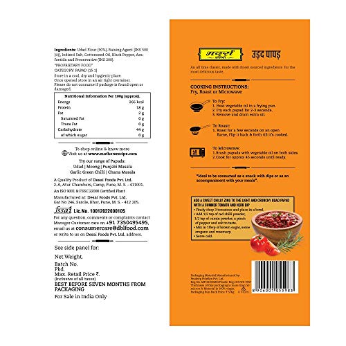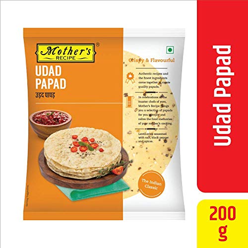 Mothers Recipe Udad papad 200gms (Lentil crisp seasoned with black pepper spices & salt authentic traditional recipe) This delicious papad is made from 100% Udad dal. An all time classic papad made with the finest sourced ingredients for the most authentic & delicious taste. Enjoy with This papad is ideal to be consumed as anytime snack with dips or as an accompaniment with your meals. How to Make To Roast : Roast for a few seconds on an open flame flip it back and forth till its cooked To Fry : Heat vegetable oil in a frying pan fry each papad for 2-3 seconds remove & drain extra oil. To Microwave : brush papads with vegetable oil on both sides cook for approx. 45 scons until ready Unique Features: machine made hygienically packed