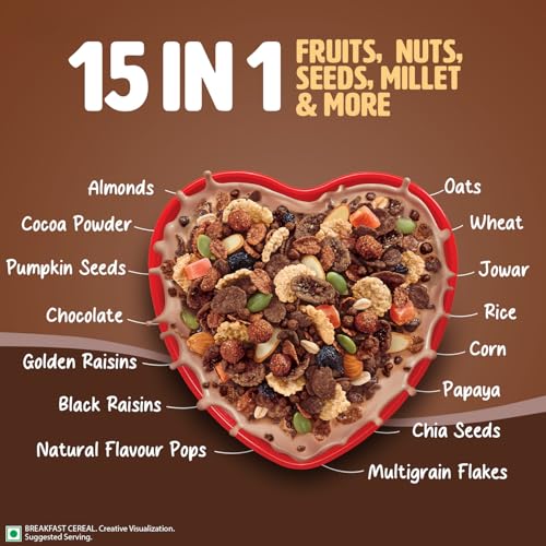 The right start can make all the difference to your day â that's where Saffola Muesli Choco Crunch with Flavour pops steps in offering a delightful blend of flavours and nutrients to kickstart your day. This Choco Crunch Muesli will give you the delicious chocolaty burst of flavour and crunch with the unique flavour pops! A blend of millet seeds fruits and nuts makes this a powerhouse breakfast cereal and is a breakfast of champions that is as nourishing as it is delicious! To top it off it has the crunchy Flavour Pops that add a burst of crunch & flavour starting your day on a happy note. NO but it's not just about taste â our Muesli is a treasure trove of dietary fibre proteins & essential vitamins. It's free from any unwanted nasties like Maida Palm oil Artificial Flavours or Artificial Colours. It has 15 in 1 Fruit and Nuts Seeds Millet & more to give you the nutrient rich breakfast. There are a variety of available Cereals for breakfast what makes Muesli stand out is that it has the goodness of wholegrain protein fibre and to top it off it is yummy! Saffola Muesli with Natural Flavour Pops makes your breakfast very exciting making your day start on a happy note! Every bite is a delicious burst of rich flavour and irresistible crunch that will instantly cheer you up. Indulge in the delicious goodness of Choco Crunch. Fill your day with Joy!