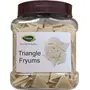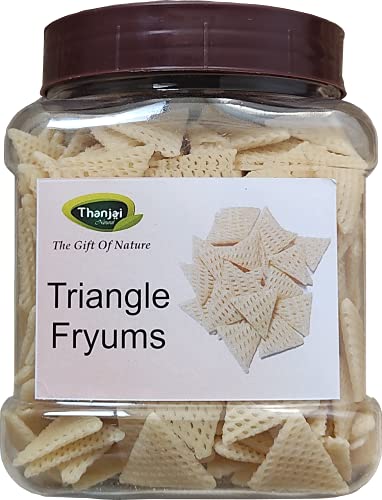 Fryums are ready to fry papads that come in various fun shapes and sizes - round ring star pipe triangle wheel long flat or 3D which make them specially appealing to kids. These healthy snack foods made of flour and potato/corn/tapioca starch are a great alternative to chips. The tasty and crunchy fryums can be served as an evening munch just like any other namkeen as fresh salty snack with tea coffee or any other beverages. along side meals as pappadam or binge eating while work. Flat looking triangle fryums (also known as crunchy samosa papad) puff up into crunchy 3D triangle shaped papads instant snacks that can be served fresh whenever you want. You can also Air Fry or Microwave them. How to Fry Thanjai Natural triangle papad: 1. Heat the oil to high temperature (approx 185 - 195 degree Celsius). Avoid smoking or burning of the oil. 2. To check if the oil is heated enough drop a small piece of fryum in the oil and it should puff up and rise to the surface 3. Switch the heat to somewhere between medium and high 5. Slide or Drop the fryums carefully into the oil 6. As they puff and rise to the surface take them out with slotted spoon shaking off the oil. 7. Place them on paper towel to remove excess oil before serving. 8. Sprinkle chat masala to taste. Storage Instructions: Always store fryums in air tight containers in cool dry place away from moisture or direct sunlight. Ingredients: Refined Wheat Flour Whole Wheat Flour Rice Flour Tapioca Starch Iodized Salt Corn Flour Corn Starch Sugar & Refined Palm Oil.