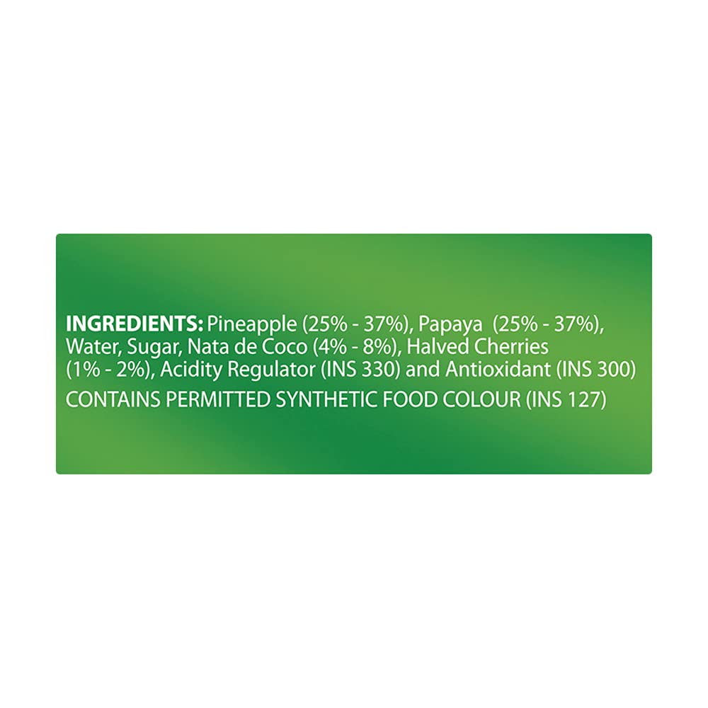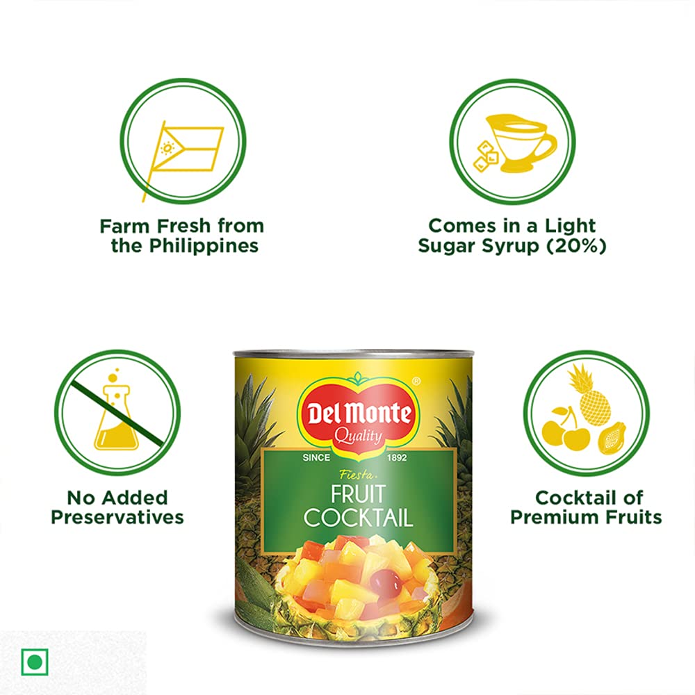 As pioneers in packaged fruits with a heritage that goes back more than a century Del Monte believes in sourcing the tastiest and best quality fruits from around the world for our consumers in India. It is this philosophy that drives us to source the juiciest Pineapple Slices and Tidbits from Philippines; the most succulent Peach Halves imaginable from South Africa and exquisite Prunes and Cranberries from North and South America. Del Monte Fruit Cocktail is a cocktail of premium fruits like Pineapple Papaya Nata De Coco & Halved Cherries.