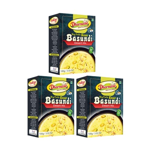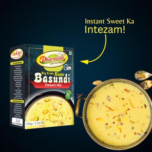 Dharmasut Dry Fruit Kesar Basundi Powder – The Desi Dessert Hack You Can't Miss! Make Instant Basundi in just 5 minutes with 2 steps – Mix 100g Basundi Powder with 500ml Milk Boil and its Ready! For that Chill Vibe Serve Chilled in Summer and Garam in Winter. Dharmasut Kesar Basundi Mix is 100% Natural with Real Dry Fruits Kesar and Sugar – So no extra cheeni needed we have added all the mithaas you need. Weather its Family Gathering Birthday Party or Weddings Basundi Sweet is Perfect for all Occasion. Trust us try it and you will definitely love it!