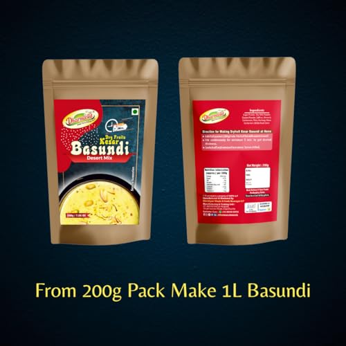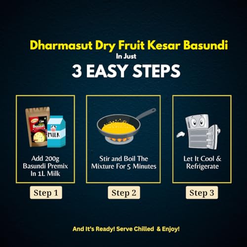 Dharmasut Dry Fruit Kesar Basundi Powder – The Desi Dessert Hack You Can't Miss! Make Instant Basundi in just 5 minutes with 2 steps – Mix 100g Basundi Powder with 500ml Milk Boil and its Ready! For that Chill Vibe Serve Chilled in Summer and Garam in Winter. Dharmasut Kesar Basundi Mix is 100% Natural with Real Dry Fruits Kesar and Sugar – So no extra cheeni needed we have added all the mithaas you need. Weather its Family Gathering Birthday Party or Weddings Basundi Sweet is Perfect for all Occasion. Trust us try it and you will definitely love it!