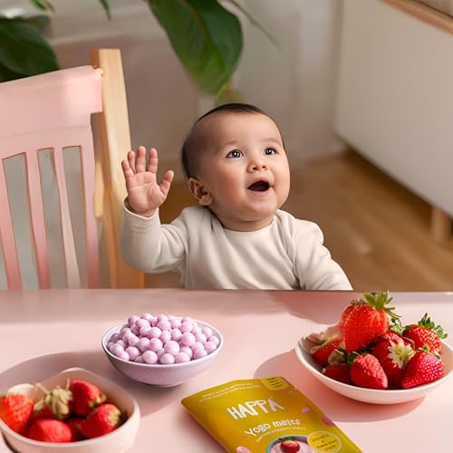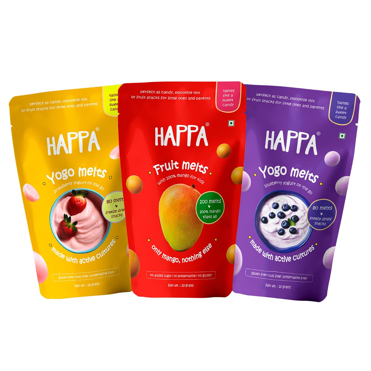 Happa Fruit Melts : 100% only fruit no other additive Happa Yogos: Tiny bursts of goodness! Crafted from wholesome yogurt and fruit Happa Yogos are specially designed yogurt drops that effortlessly melt in your mouth. These delightful treats offer babies and toddlers a delicious and wholesome snack that you can truly feel good about.