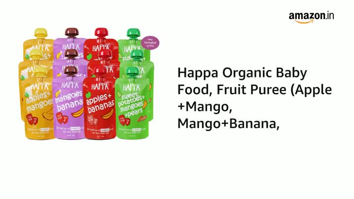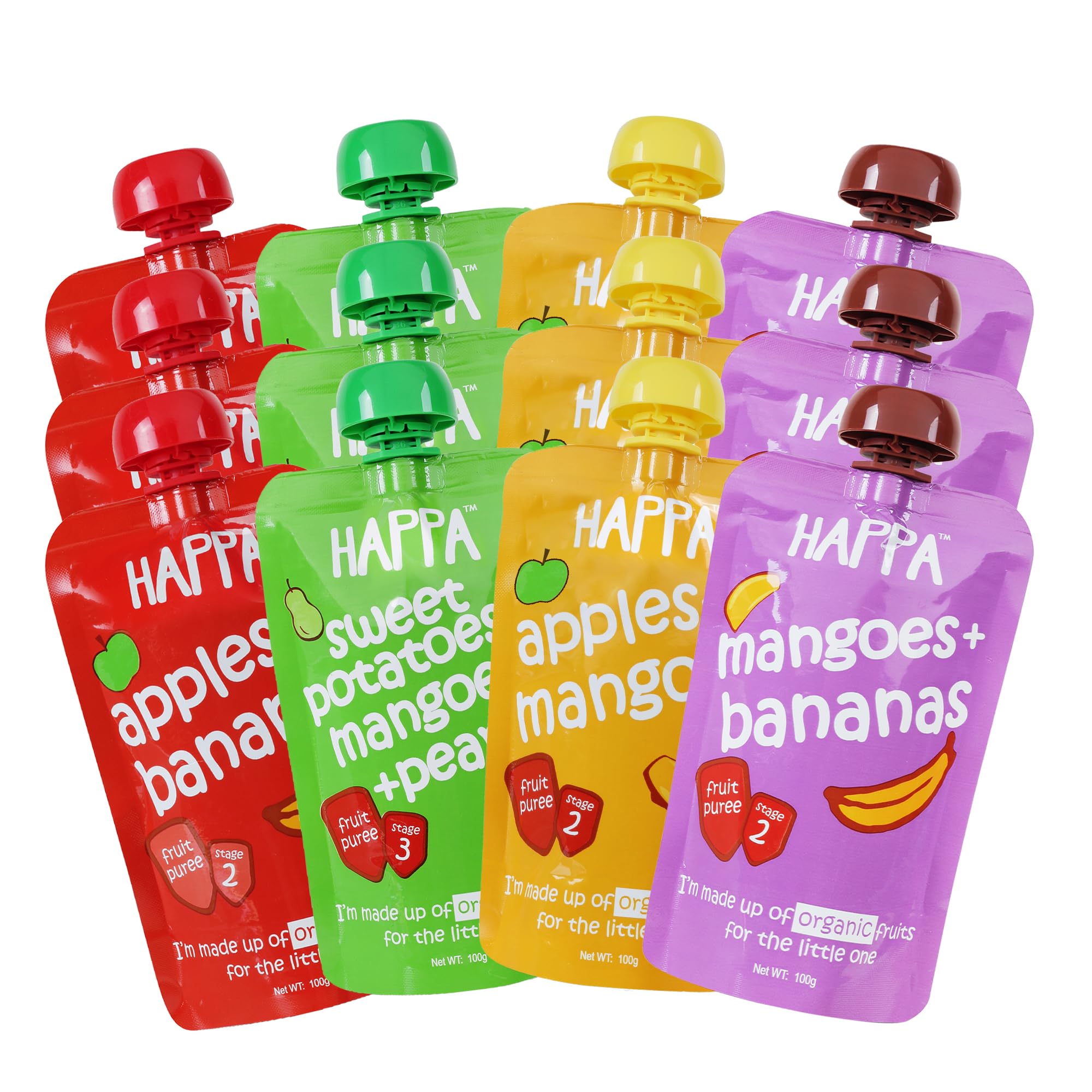 Happa Organic Food Fruit Puree (Pack of 12 Apple + Mango Mango + Banana Apple +Banana Sweet Potato + Mango + Pear) Stage 3 12 Pouches 100 Gram Each