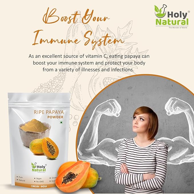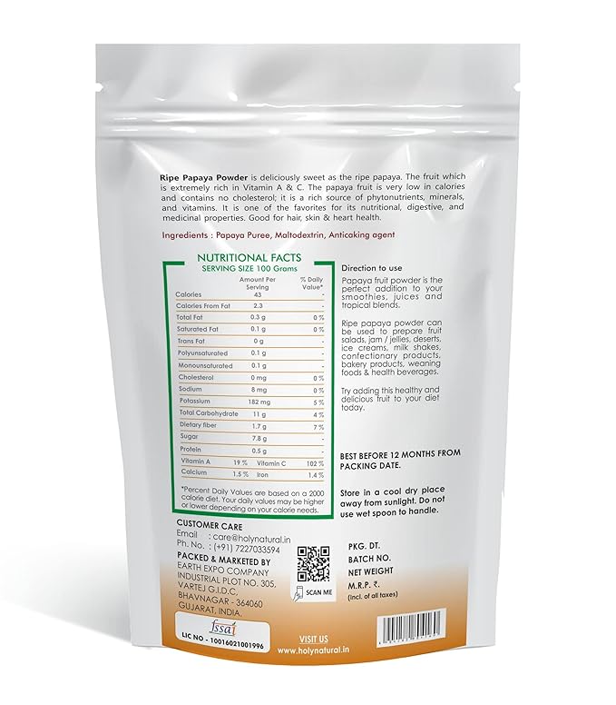 • Real Taste & Aroma – Holy Natural Ripe Papaya Fruit Powder is pure & natural. No added colour, flavour or preservative, even then all real characteristics, aroma, taste are intact. Rich in taste.