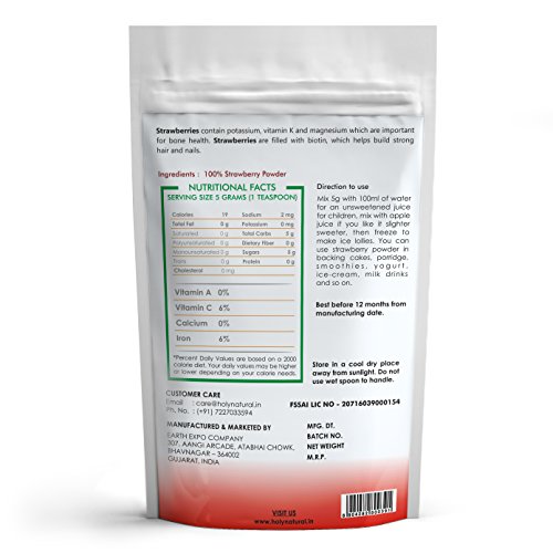 Strawberries contain potassium vitamin k and magnesium which are important for bone health. Strawberries are filled with biotin which helps build strong hair and nails. Direction to use: mix 5g with 100ml of water for an unsweetened juice for children mix with apple juice if you like it slighter sweeter then freeze to make ice lollies. You can use strawberry powder in backing cakes porridge smoothies yogurt ice-cream milk drinks and so on.