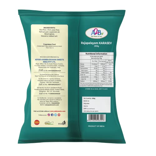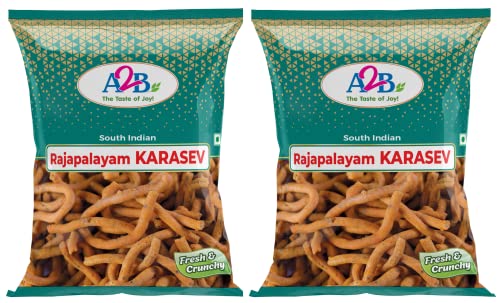Adyar Ananda Bhavan as a brand is implementing innovative ideas in providing tasty and mouthwatering savories sweets to the amending needs of our customers. The yummy delicacies are lovingly made by maintaining good hygiene levels at our well-equipped and automated kitchen. We are so happy about taking the utmost pride in being the first and preferred choice of the number of people in the city. We have professional staff members with years of experience who maintains high standards to offer you an appetizing and wide variety of savory items that rejuvenates your banquet or bean feast. We ensure you expeditious service and best quality savories to satisfy our esteemed customers. Our savories sweets menu consists of delicious and crunchy AAB Special Mixture Andhra Murukulu karasev Moong Dhal Mini Thenkuzhal Potato Masala Chips and much more exciting savories. A2B is simply a one-stop shop to have very palatable savories and authentic Indian sweets. Once you try savories desserts at our A2B savories sweets shop we can assure you that you will keep coming back again and again for more! We also take bulk orders. Order delivery at our savories sweets online right now and enjoy our spicy tangy and toothsome savory items. A2B Snacks -Rajapalayam Kara Sev 200gm