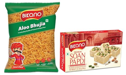 Bikano Aloo Bhujia 1 kgIt is a crispy light and spicy short noodle shaped namkeen made of potato. Very famous in India during serving the guest.Bikano Soan Papdi Milk 500 Gm Extra 20% (500g+100g Extra)Crispy and flaky texture sweet which gives milky taste.