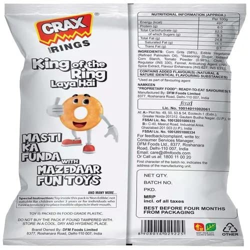 Your all-time favourite snack from Crax now in amazing tomato tangy flavour. Baked non-fried snacks with the goodness of corn and fibre. Pop in a handful of chips or munch them one by one. The great melt in mouth taste of these delicious and crunchy rings is enjoyed by everyone. Not to forget the exciting toy for kids its a bundle of joy. Contains no cholesterol and trans-fat free.