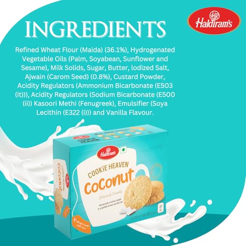 Whether enjoyed with a hot cup of tea or coffee or as a standalone snack Haldiram's Coconut Cookies offer a delightful escape to a tropical paradise. Their unique flavor profile and meltinyourmouth texture make them a favorite choice among cookie enthusiasts. Haldiram's Coconut Cookies are delightful treats that capture the tropical essence of coconut. These cookies are made with a perfect blend of buttery goodness and the sweet nutty flavor of coconut creating a truly indulgent snacking experience. The cookies have a light and crumbly texture that melts in your mouth providing a delicate and satisfying bite. The inclusion of coconut adds a rich and aromatic taste with hints of sweetness and a subtle tropical twist. Haldiram's Coconut Cookies are perfect for coconut lovers looking for a sweet treat. The combination of buttery goodness and the natural flavors of coconut creates a harmonious balance that is both comforting and irresistible