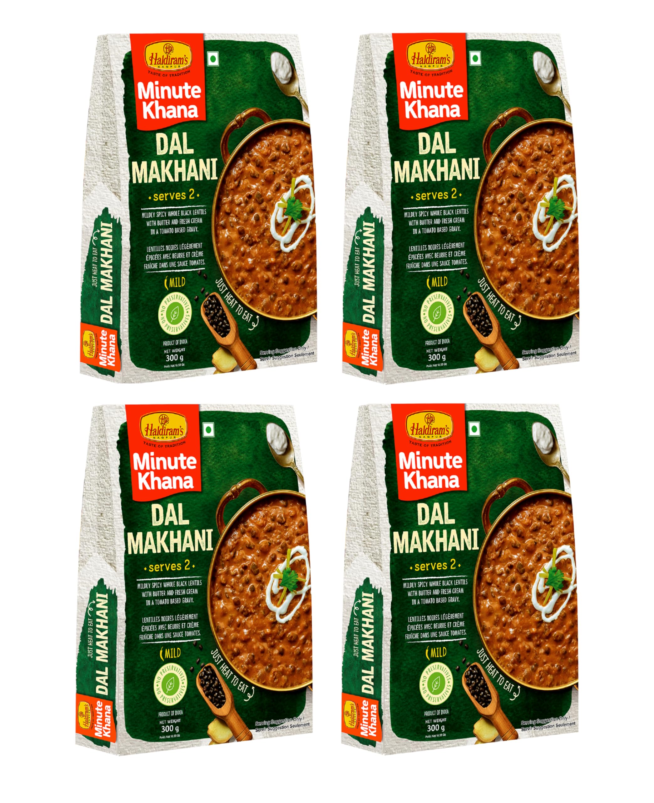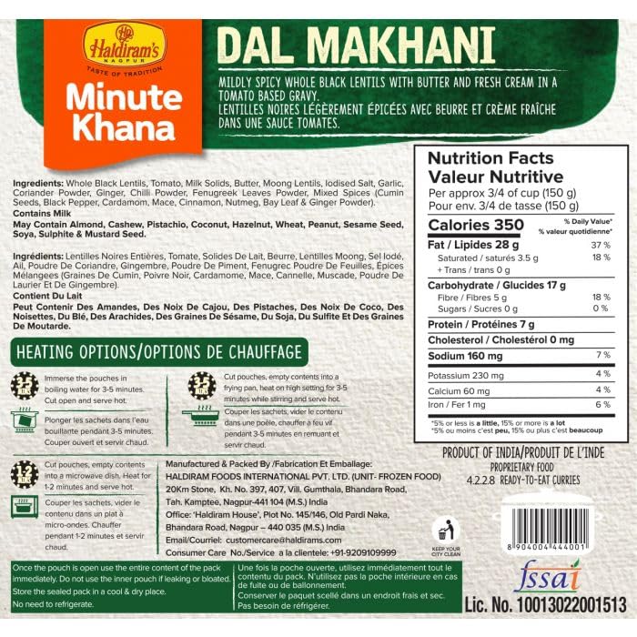 Ready To Eat Dal Makhani 300g (Pack of 4) Combo Savor the rich and creamy delight of Haldiram's Nagpur Ready To Eat Dal Makhani with this convenient pack of four. Each 300g serving offers a luxurious blend of black lentils and red kidney beans slowcooked in a buttery tomatobased sauce seasoned with a perfect mix of spices for an authentic taste of North Indian cuisine. Ideal for a quick and delicious meal just heat and serve to enjoy the comforting and hearty flavors of this classic dish. Whether for a family dinner a gathering with friends or a hasslefree lunch this combo pack ensures you have a gourmet meal ready whenever you need it. Trust Haldiram's to bring the traditional taste of Dal Makhani to your table with convenience and quality.