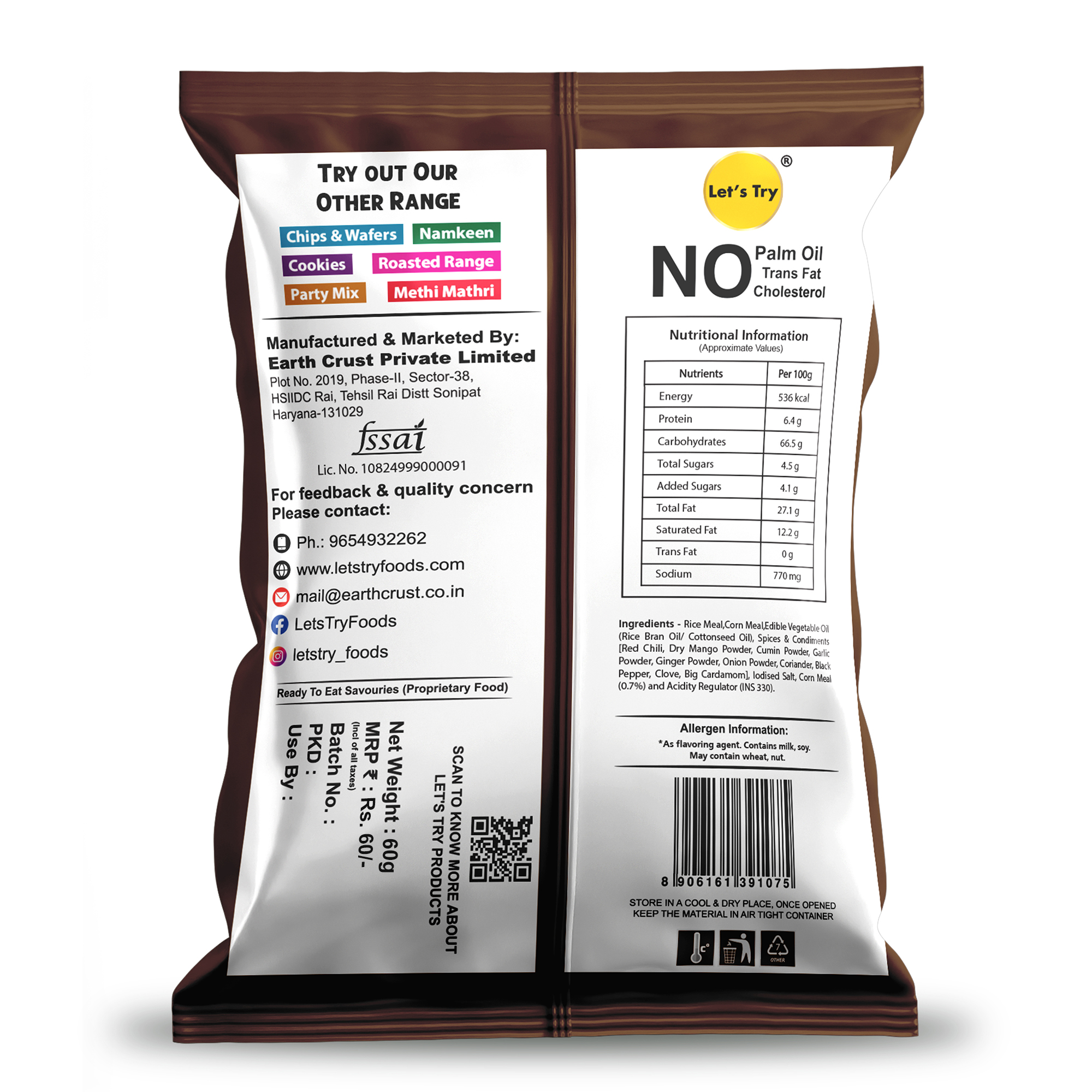 At Lets Try, we believe healthy snacking can be fun too. We follow traditional methods to make all our snacks, just like your grandma used to. We use 100% groundnut oil. No preservatives, No artificial flavors, or colors, no trans fats or cholesterol