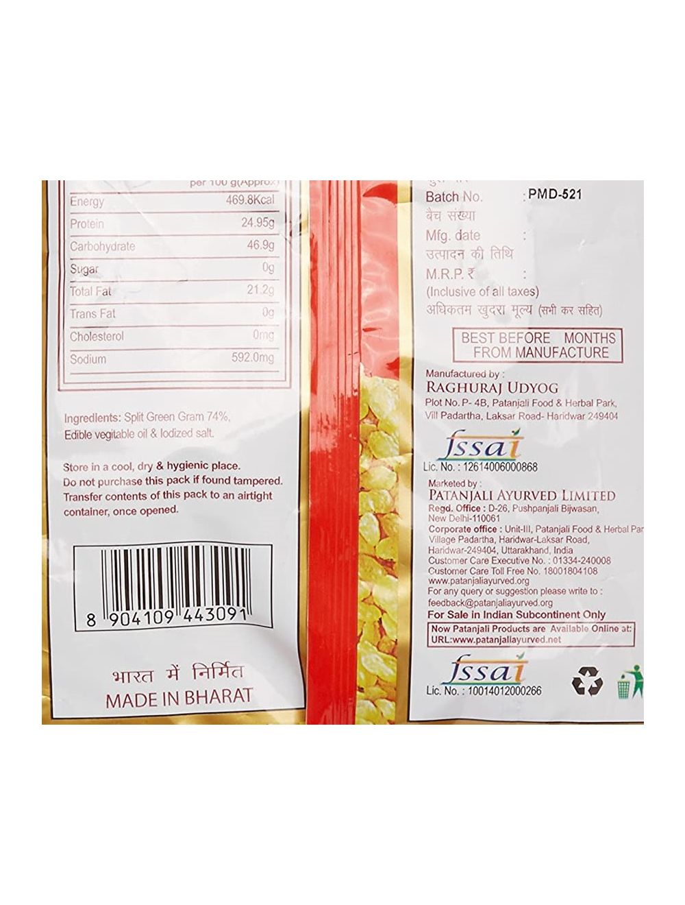 Celebrate snack times with crunchy Patanjali Moong Dal Namkeen. With zero cholesterol, zero sugar, but lots of protein from the pulses, this namkeen is a healthy option to replace the usual fried, calorie-packed munchies. Made from roasted green gram, it is a hot-favourite at teatime. TastySpicyA healthy snack option.High in Protein0% transfat, Cholesterol and Sugar.Improves digestionCrunchy? Split green gram 74 % ? Edible vegetable oil ? Iodized salt