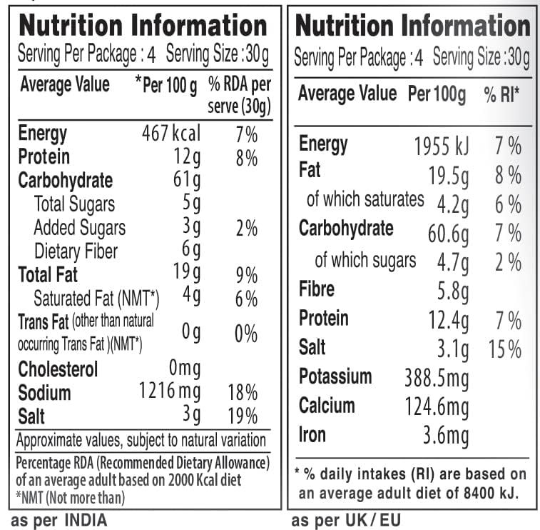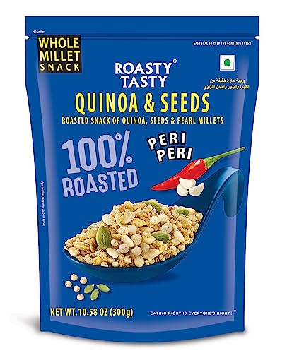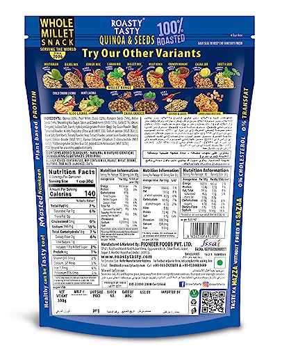 Quinoa (30%) Pearl Millet (Bajra) (22%) Pumpkin Seeds (14%) Melon Seeds (14%) Seasoning Mix {Sugar Spices and Condiments [Chilli (1.1%) Garlic(0.1%) Onion Oregano] Iodized Salt Starch Hydrolysed Vegetable Protein (Soy) Soy Sauce Powder (Soy) Tamarind Powder Acidity Regulator [Citric acid (INS/E 330) Sodium acetate (INS/E 262(i))] Black Salt Milk Solids (Milk) Tomato Powder Yeast Extract Powder Lemon Juice Powder Anticaking Agent [Silicon dioxide (INS/E 551)] Flavour Enhancer [Disodium 5'-ribonucleotide (INS/E 635)]} *Edible Vegetable Oil (Rice Bran Oil) [Added 0.03% Antioxidant (INS/E 307b)] *Oil sprayed for seasoning application only.