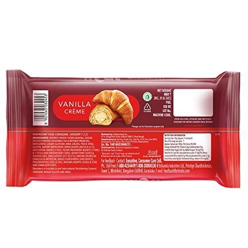 Savor the exquisite Britannia Treat Croissant - a symphony of finest nationwide flour delicately kneaded into the softest dough and expertly baked to a golden perfection. Luxuriate in each bite of this heavenly delight featuring luscious Vanilla creme embraced by layers of pillowy mouthwatering bread. An irresistible twist on snacking ideal for satisfying mid-day urges or late-night cravings. Believing in delivering fresh and healthy products Britannia India manufactures some of India's favourite brands like 50-50 Tiger NutriChoice Bourbon Good Day Milk Bikis and Little Hearts.