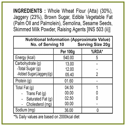 Sodium Aluminum Sulphate (INS 521) Starch Mono Calcium Phosphate (INS 341) Jaggery(23%) Whole Wheat Flour(Atta)(30%) Vegetable Fat (Palm Oil Palmolein) Refined Wheat Flour (Maida) Custard Powder Milk Solids Cardamom Baking Soda Baking Powder (Sodium Bicar