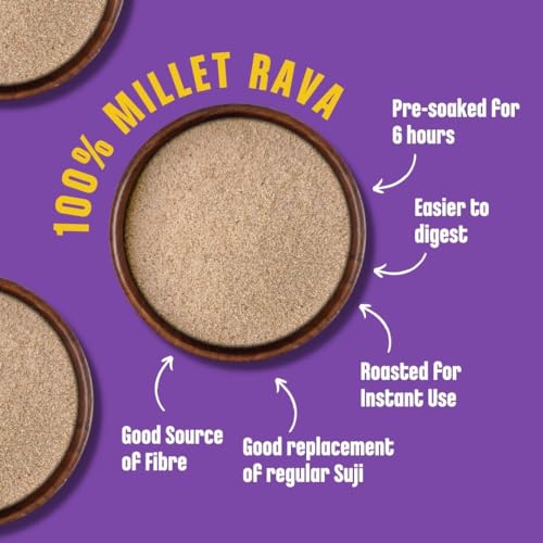 • Freshly made ready to cook 2 packs of multipurpose Rava 500g. Pack 1 - Kodo Millet Rava 250 gms Pack 2 - Sprouted Ragi/Finger Millet Rava 250 gms
