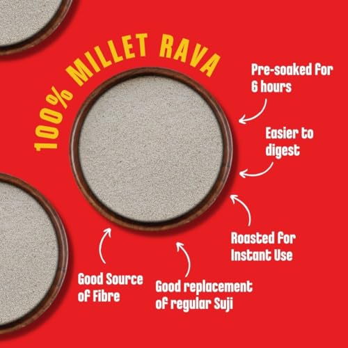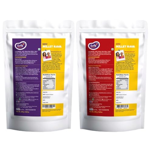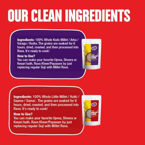 • Freshly made ready to cook 2 packs of multipurpose Rava 500g. Pack 1 - Little Millet Rava 250 gms Pack 2 - Kodo Millet Rava 250 gms