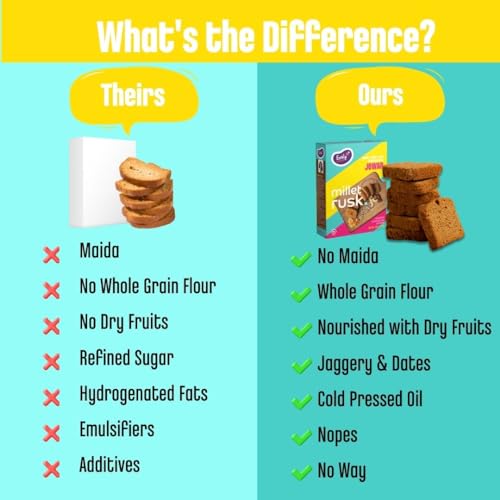 ZERO JUNK PROMISE: Early Foods Millet toast biscuits are a guilt-free snack as it contains no maida no refined oil maltodextrin emulsifiers preservatives or additives! Made with honest ingredients just like your home's kitchen.