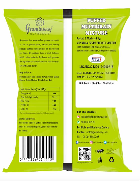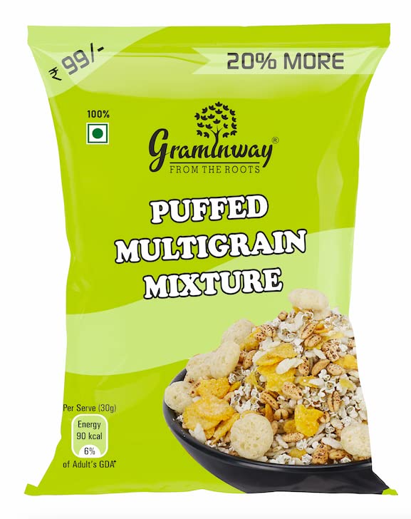 Graminway Puffed Multigrain Mixture is a healthy snack 100% natural and loaded with essential nutrients. Made with healthy grains such as Puffed Barley Rice Flakes Jowar Puff Makai Flakes and mildly spiced these snacks can be enjoyed for chai time or for kids instead of deep-fried snacks.