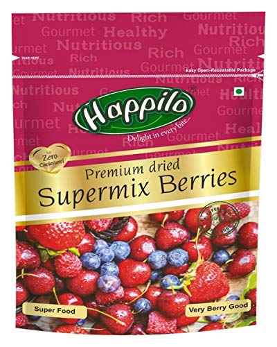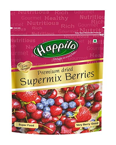 Happilo Premium International Super Mix Berries 200gHappilo Super Berries is one mixed bag that offers up not-to-be-missed super surprises. High in anti oxidants and dietary fiber you can mix them with some almonds and walnuts for you own custom supreme trail mixes. This super mix is perfect to add to your oatmeal muesli corn flakes and smoothies. Time to happy lovely and healthy.Happilo Premium International Supermix Berries 200g (Pack of 2)Happily has travelled the world to get the finest gourmet dry fruits dried fruits nuts berries and dates 100 percent natural and authentic. Indulge into the gourmet and grocery world of Happily with awesome natural nuts and dry fruits along with the unique dry fruit mixes fusions and flavoured dry fruits healthy seeds and dried berries specially crafted for your taste and health. Happily dry fruit gift boxes and festive dry fruits and nuts gift pack brings health happiness and love to gift to your colleagues friends and family. We bring you the taste and health together in single pack in the finest of packing packed in an art of the state facility certified by all majors like fssai iso. Every Happily pack is a perfect dry fruits gift for every festive occasion.