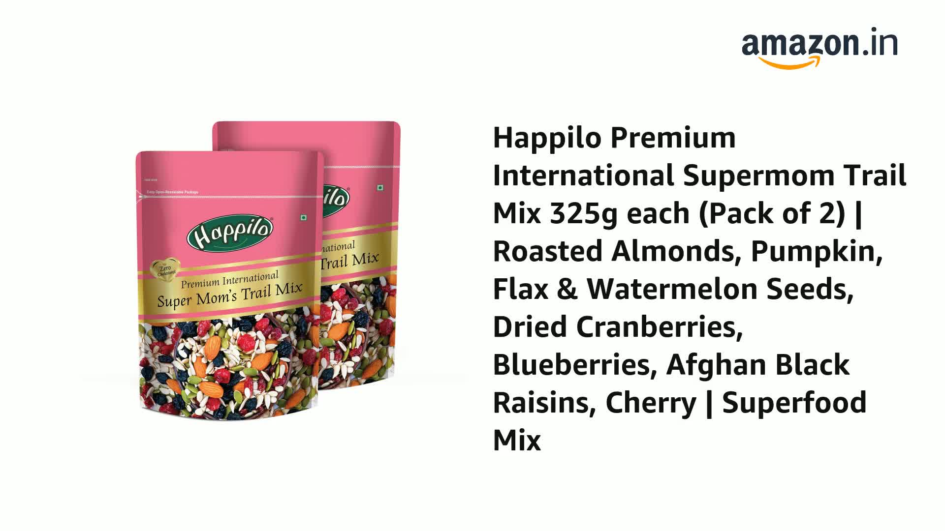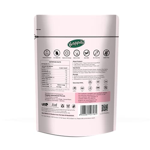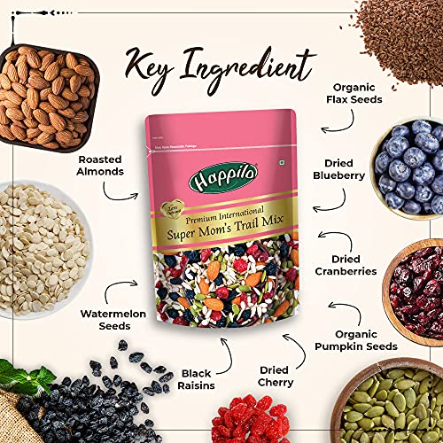 Happilo Premium International SuperMOM Superfood Mix it's Made with love with #MomChoice ingredients. Made from nutritious and wholesome 9 Superfoods i.e. Roasted Almonds Roasted Pumpkin Seeds Roasted Flax Seeds Roasted Sunflower Seeds Roasted Watermelon Seeds Dried Cranberries Dried Blueberries Black Raisins Black Currants. Snack on it at any time! Whether its mid morning mid day or midnight hunger pangs! Top up on breakfast oatmeal bowls or yogurts. Add as an ingredient to make cakes granola bars breads. Quality assured - Happilo products are rigorously tested against the industry's best quality standards.