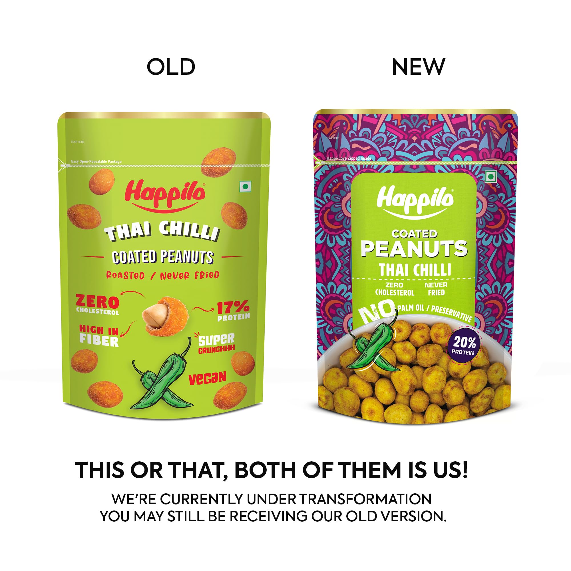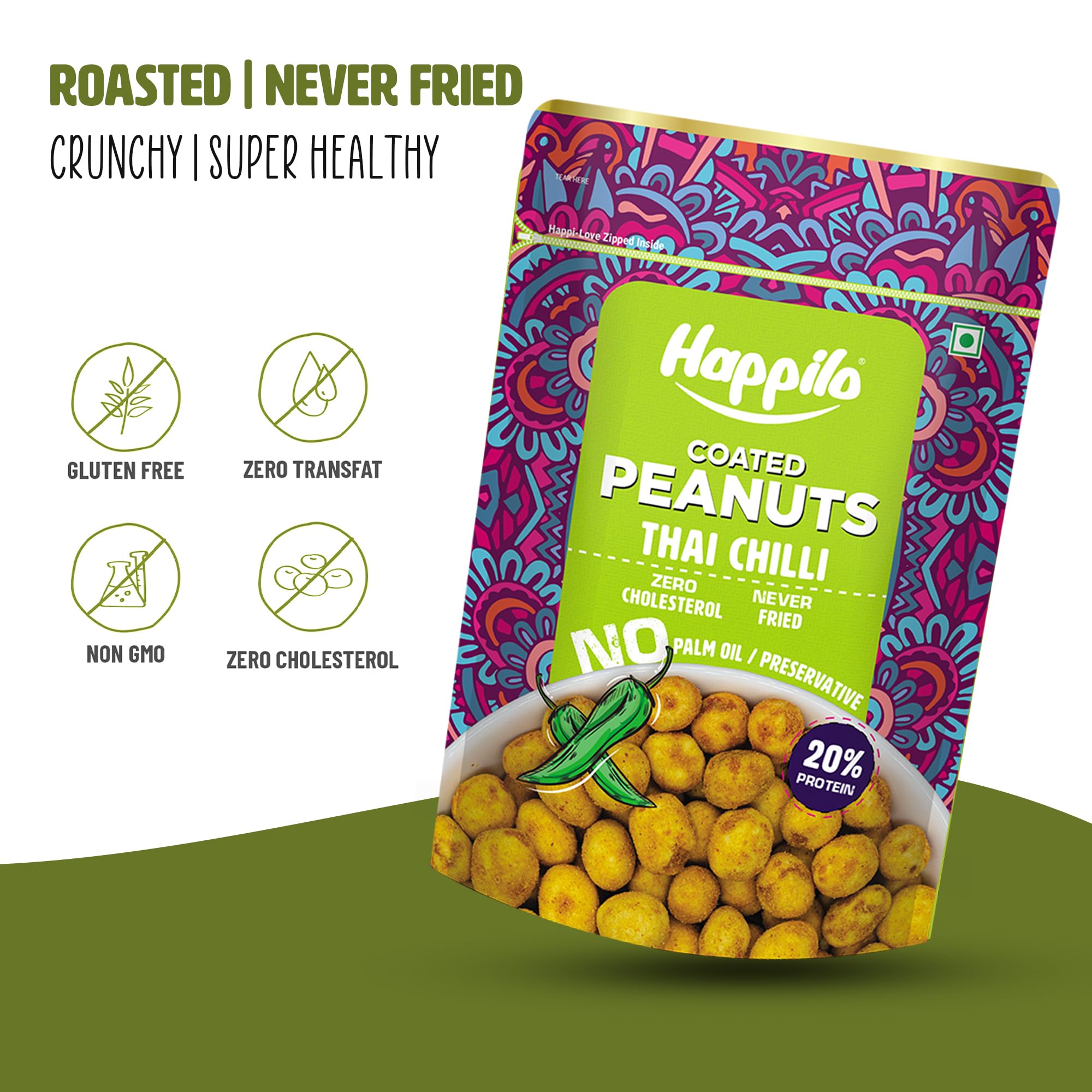 • Roasted Coated - Its Roasted Not Fried Roasted Coated Peanuts with Thai Chili Flavouring is the perfect option if you are craving a tasty between-meals snack.When it is severed it looks yummy and delicious and after eating it you want more and more