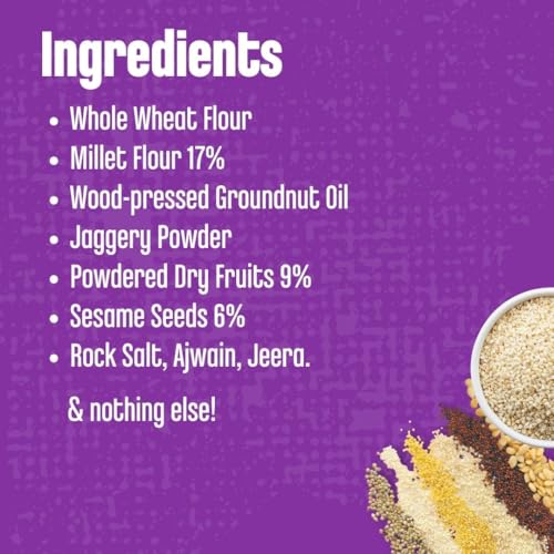 Organic Whole Wheat Flour Organic Millet Flour 17% (Kodo Millet/Kodra/Varagu Foxtail Millet/Kangni/Navane Ragi/Naachni/Finger Millet Pearl Millet/Bajra/Sajje Organic Little Millet/Saame/Kutki) Groundnut Oil Organic Jaggery Powder 13% Powdered Dry Fruits 9