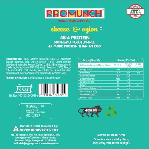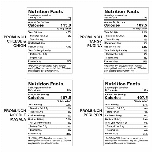 PROMUNCH Roasted Soya Snack | High-Protein | Healthy | Gluten-Free | Travel pack (Cheese & Onion Peri-Peri Noodle Masala Tangy pudina) Pack of 4 30g each