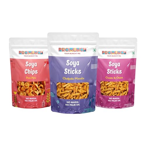 PROMUNCH Soya Sticks (Chatpata Masala Cream onion) | Soya Chips (Peri Peri) | Crispy snacks | Namkeen savoury chips | No Palm Oil And Maida | - 30g Pack of 3