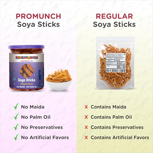 Dive into the flavorful world of PROMUNCH Soya Sticks - Chatpata Masala! Crafted from the best ingredients these tasty snacks are not only bursting with zesty masala flavor but are also a health-conscious choice. With no palm oil and no maida you can indulge guilt-free. Each crispy stick is Packed with protein making it the perfect snack for any time of the day. Whether you’re watching a movie hosting friends or simply craving something delicious PROMUNCH Soya Sticks are your go-to choice for a satisfying and nutritious treat. Elevate your snacking experience with this irresistible blend of taste and health!