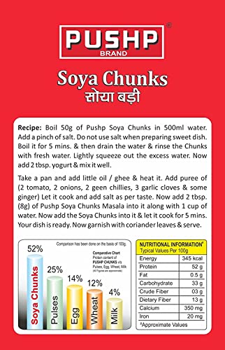 Pushp Soya chunks makes your food delicious. These soya chunks are extremely tasty and can be used in meal for dinner and lunch. These are very easy to make and comes with good health benefits. Add a healthy and nutritional alternative to your meat dishes with these protein rich soya chunks from Push Brand.
