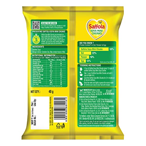 Presenting Saffola Soya Mini Chunks are processed in a way that ensures the soya mini chunks remain super soft and absorbs the flavour so well which makes your soya mini chunk dish tasty. Saffola Soya Mini Chunks is manufactured by extrusion of defatted soya flour from healthy soya seeds. We choose our ingredient carefully analyse & balance the key nutritional factors like protein dietary fibres etc. to ensure optimum quality. Finally it is extruded with strict process control to obtain soya chunks which cooks softer so that you can enjoy tender juicy and tasty chunks. It is High in Protein - 53% High in Fibre - 13% & Low in Fat (Nutritive value of Foods ICMR JFST) which aids your Family's nutrition thanks to the goodness of protein and fibre and adds great taste to their everyday food with the tender & juicy soya chunks. Chilli Soya Soya Aloo curry Soya Mutter & Soya Biryani are some of the dishes that will taste good with Saffola Mealmaker Soya Chunks. Now every soya dish will be delicious. Try Saffola Mealmaker Soya Chunks -Tasty Super Soft Soya Chunks. Soya chunk also known as soya wadi soya nuggets soya badi soyabean badi.