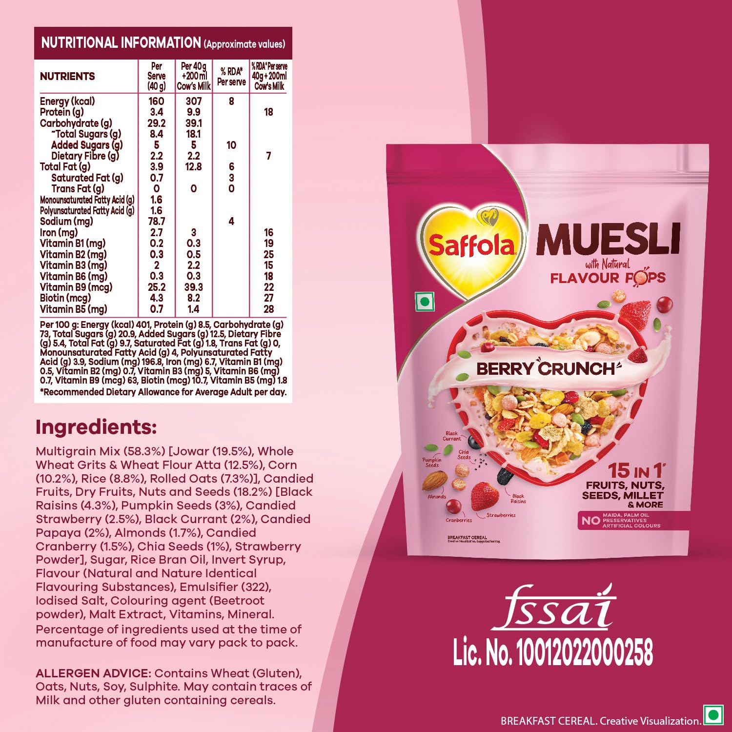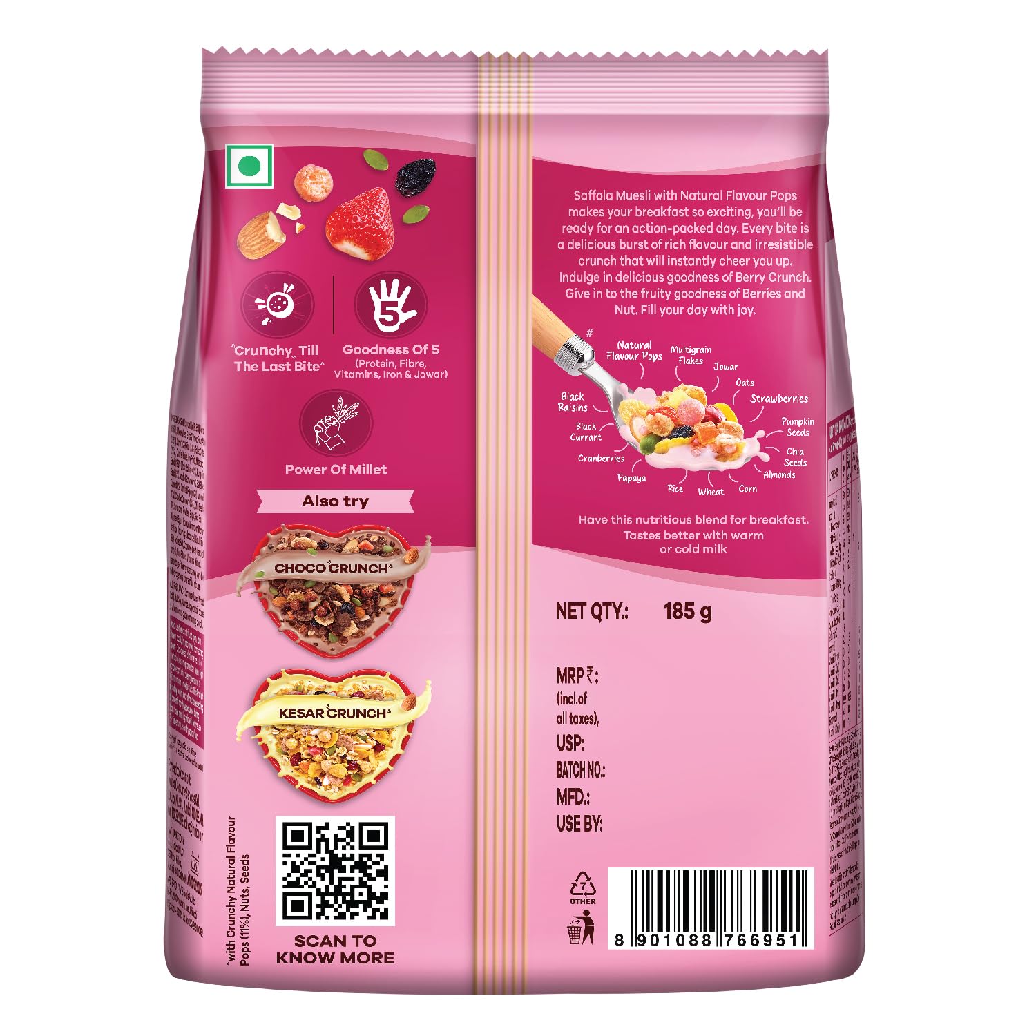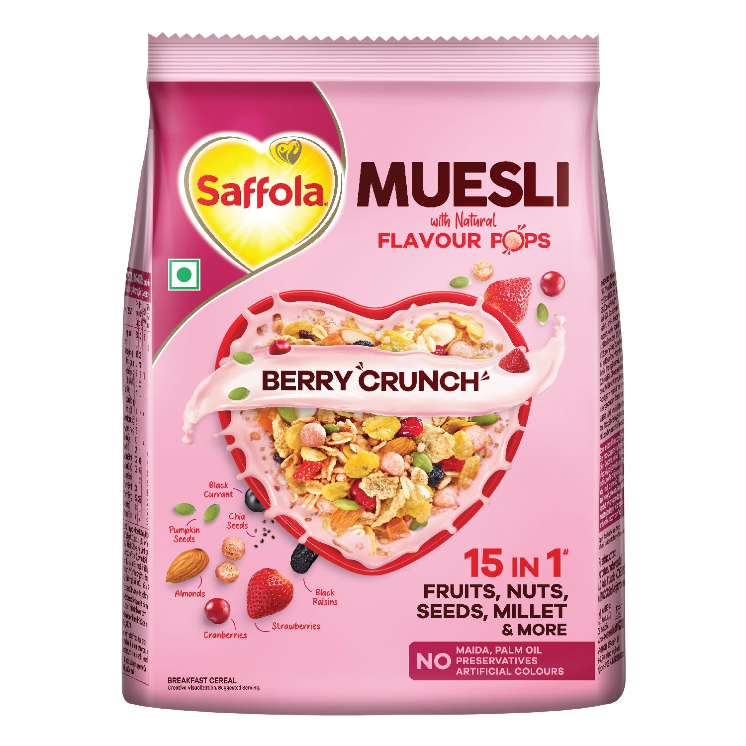 The right start can make all the difference to your day – that's where Saffola Muesli Berry Crunch with Flavour pops steps in offering a delightful blend of flavours and nutrients to kickstart your day. A blend of millets seeds fruits and nuts makes this a powerhouse breakfast cereal and is a breakfast of champions that is as nourishing as it is delicious! To top it off it has the crunchy Flavour Pops that add a burst of crunch & flavour starting your day on a happy note. NO but it's not just about taste – our Muesli is a treasure trove of dietary fibre and essential proteins. It's free from any unwanted additives like Maida Palm oil or Artificial Flavours & Colours. It has 15 in 1 Fruit and Nuts Seeds Millet & more to give you the nutrient rich breakfast. There are a variety of available Cereals for breakfast what makes Muesli stand out is that it is rich in wholegrain protein fibre and to top it off it is yummy! Saffola Muesli with Natural Flavour Pops makes your breakfast very exciting making your day start on a happy note! Every bite is a delicious burst of rich flavour and irresistible crunch that will instantly cheer you up. Indulge in the delicious goodness of Berry Crunch. Fill your day with Joy!