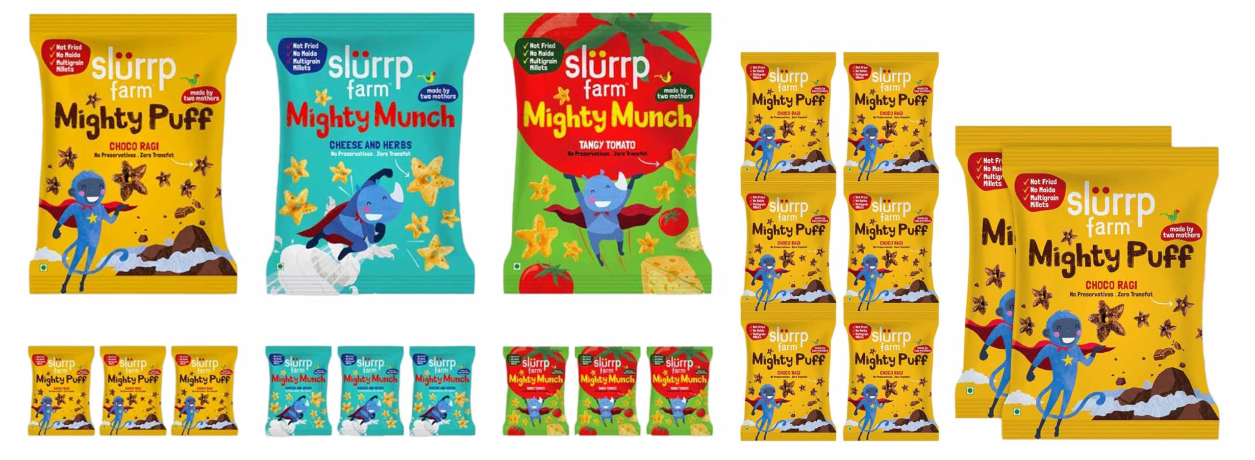 Slurrp Farm Healthy Snacks for Kids | Mighty Puff Choco Ragi Cheese & Herbs and Tangy Tomato| Not Fried No Maida | Snack for School Tiffin and Travel-Friendly | 12 x 20g packsSlurrp farm non-fried puffs are 100 percent natural filled with the goodness of super grains like ragi and jowar.Slurrp Farm Healthy Snacks for Kids | Mighty Puff Choco Ragi | Not Fried No Maida | Ragi Snack for School Tiffin and Travel-Friendly | 8 X 20g EachCrunchy-munchy and loaded with nutritional benefits the slurrp farm mighty puff and mighty munch are perfect anytime snacking options for all ages. Fun starry snacks made with ragi and jowar in a yummy chocolate flavor. You can have them both as a snack and as a breakfast cereal with a bowl of milk. Compared to other chocolate puffs on the market ours have no transfat and less sugar. Guilt free happiness - they are designed for school going kids to pop into their bags and their parents too. About the brand: at slurrp farm we are passionate about raising awareness of healthy eating for children and giving busy parents like us the convenience needed in terms of being able to find food options which are as good as what we would make at home. Our recipes always start at home from amongst our friends and families. After many home trials we perfect them in consultation with nutritionists and pediatricians.