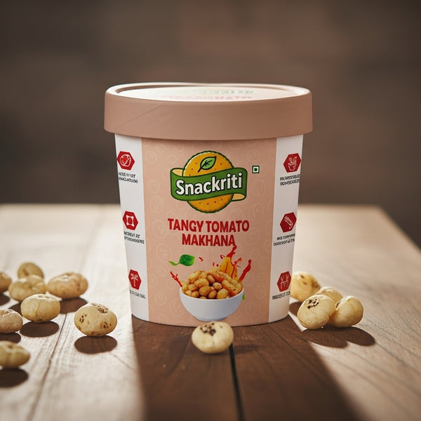 Indulge in the vibrant burst of flavor with our Tangy Tomato Makhana a delightful fusion of sun-ripened tomato seasoning and mild Indian spices, roasted perfectly on wholesome fox nuts.