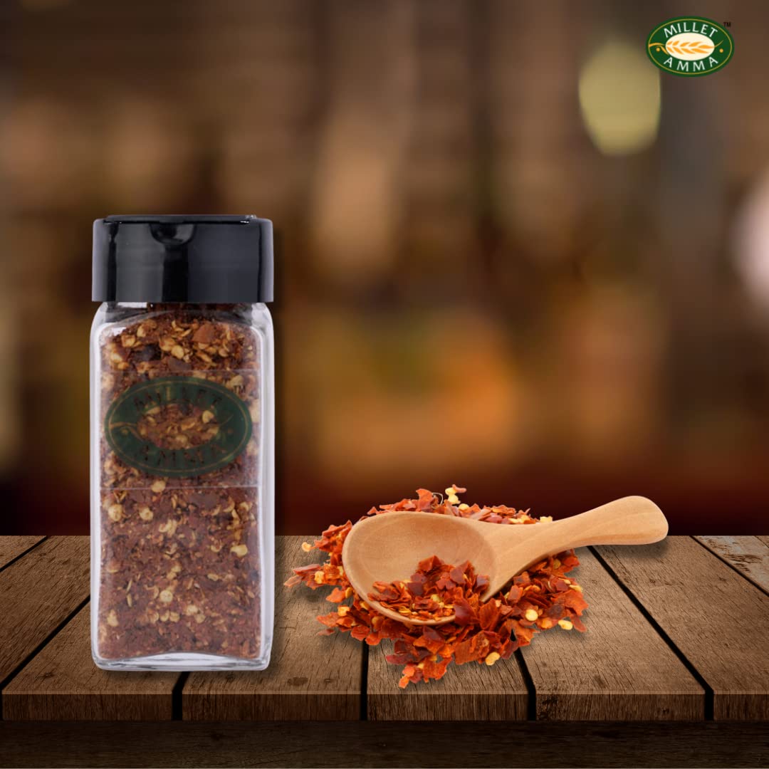 Our Red Chili Flakes are packed in a glass sprinkler bottle and can be placed on the dining table of the house to enjoy the authentic flavor on Pizzas and Pasta The Chili Flakes have strong distinctive taste and aroma as it processed in house. It is made up of ethically grown red chillies.