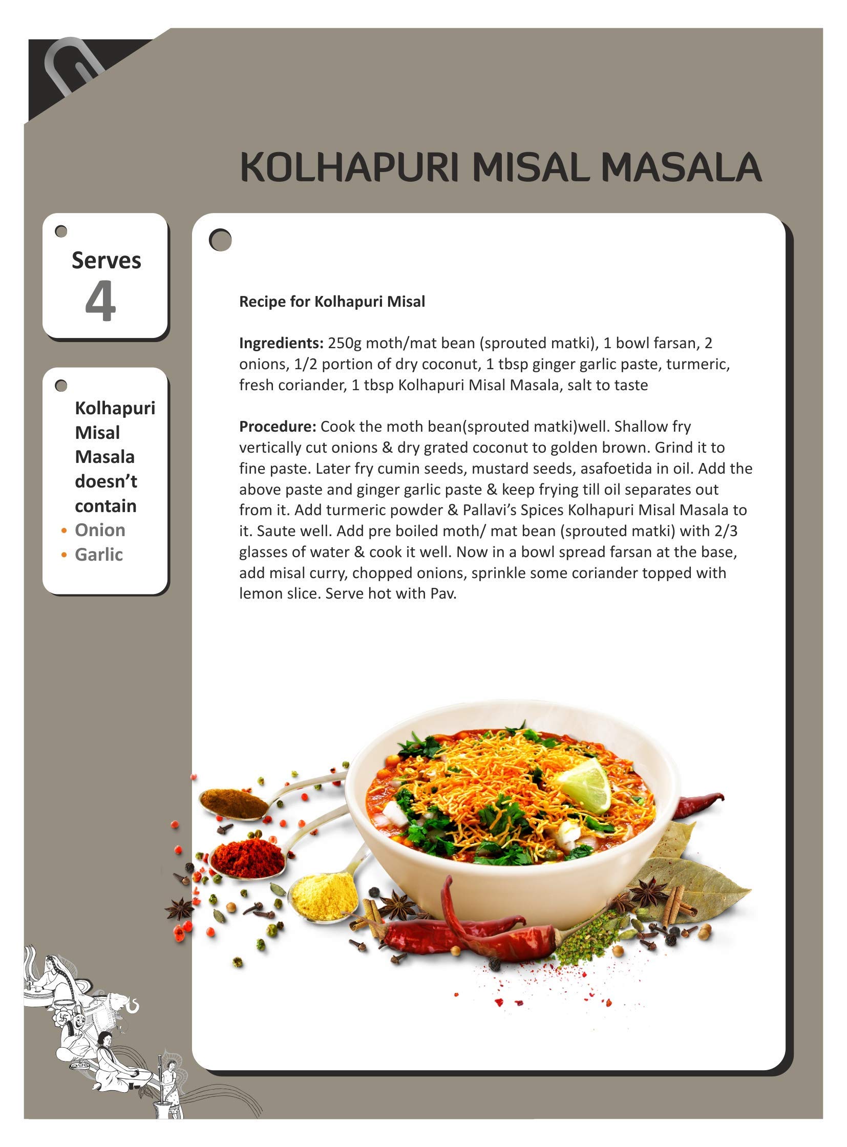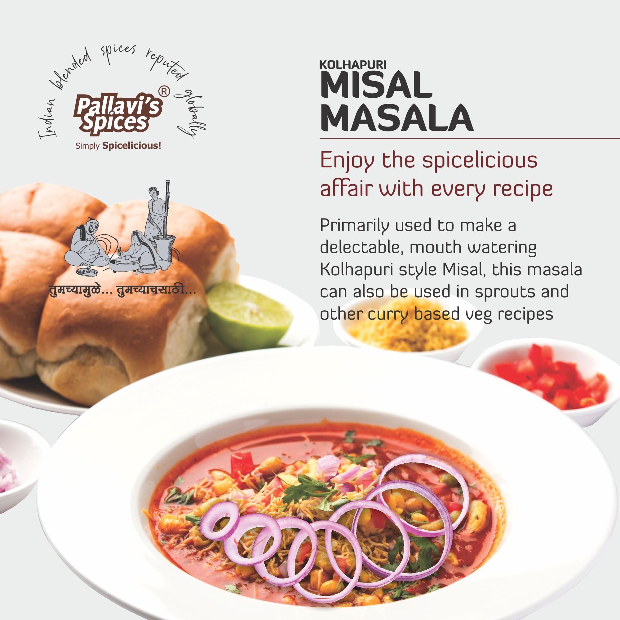 Kolhapuri Misal Masala imparts delectable taste with attractive red color and is without Onion and Garlic