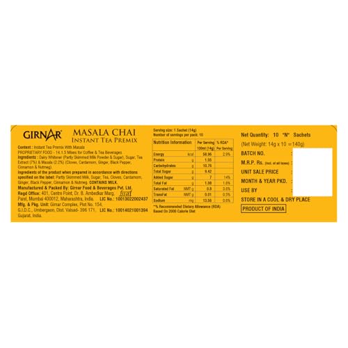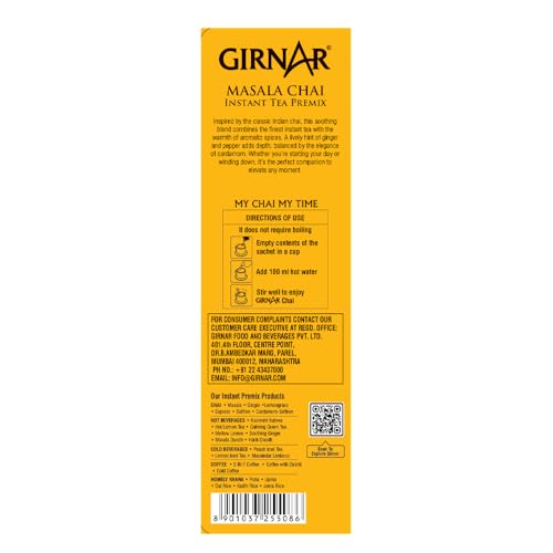When the British introduced tea in India Desi Chai was born; When Chai was introduced in an Indian home Masala Chai was born. And when Masala Chai Premix was introduced by Girnar Instant ghar-jaisi-chai was born. Girnars Masala Chai Premix is a ready-made (pre-mixed)powder of robust Desi Chai complemented by the stimulating flavour of Cardamom Cloves Black pepper and Ginger; finished with the subtlety of Cinnamon and Nutmeg.